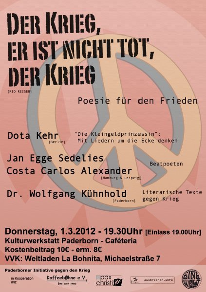 poetischen Standpunkten gegen jede Art von Krieg. Ort: Caféteria der Kulturwerkstatt Paderborn,