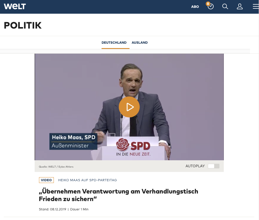 Außenminister Maas hat sich auf dem Bundesparteitag der SPD zum Thema "Verantwortung übernehmen und Frieden schaffen" geäußert: |